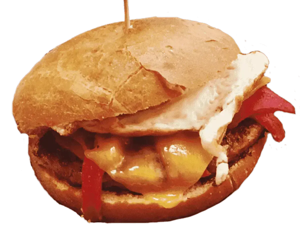 100GR DE HAMBURGUESA, CON PIMIENTO ROJO, QUESO CHEDDAR, HUEVO FRITOY PATATAS RUSTIk