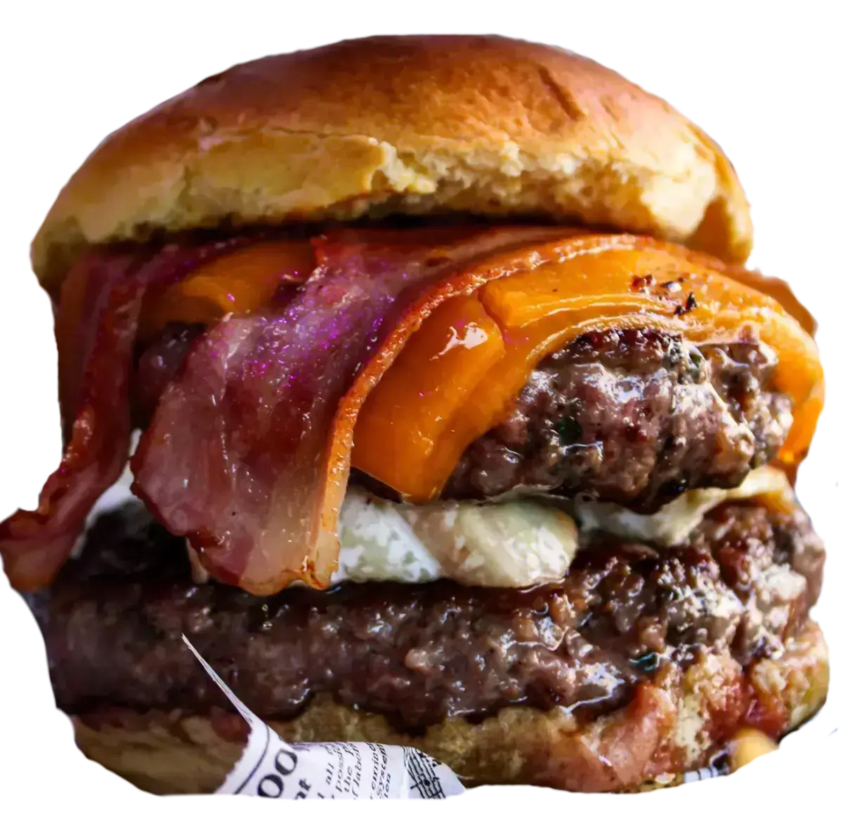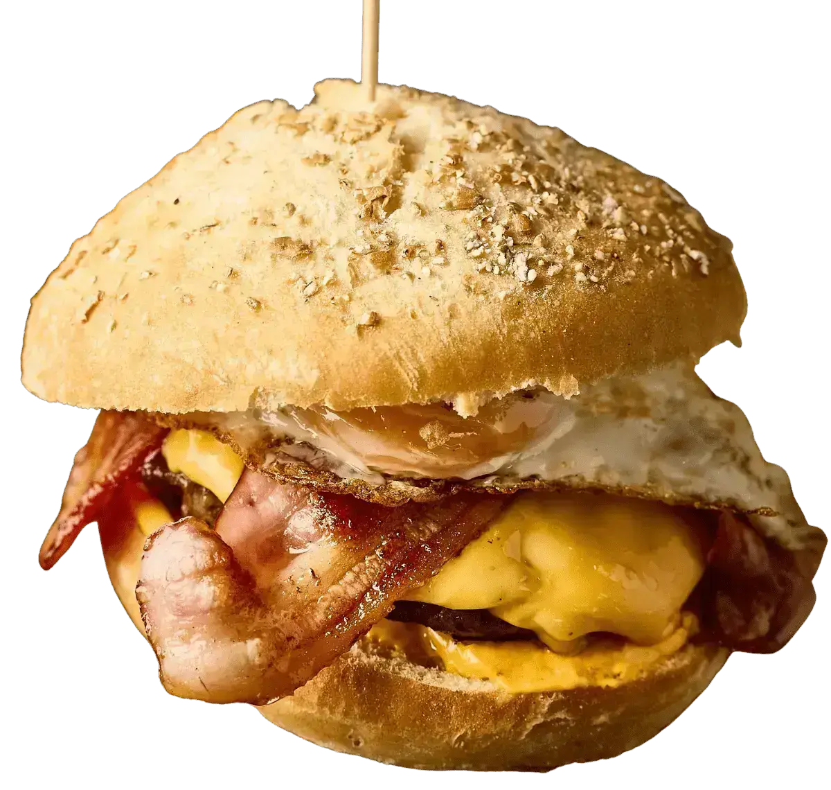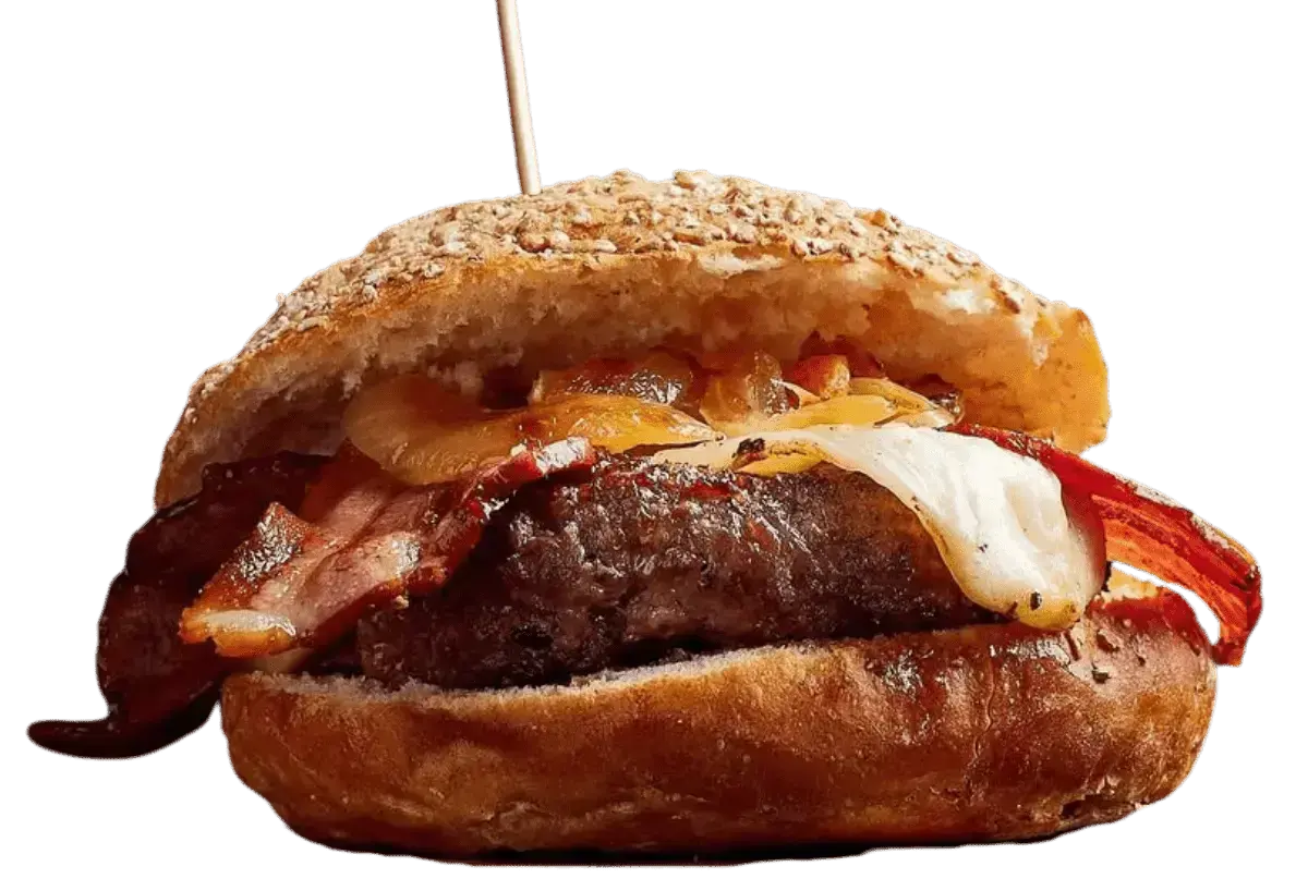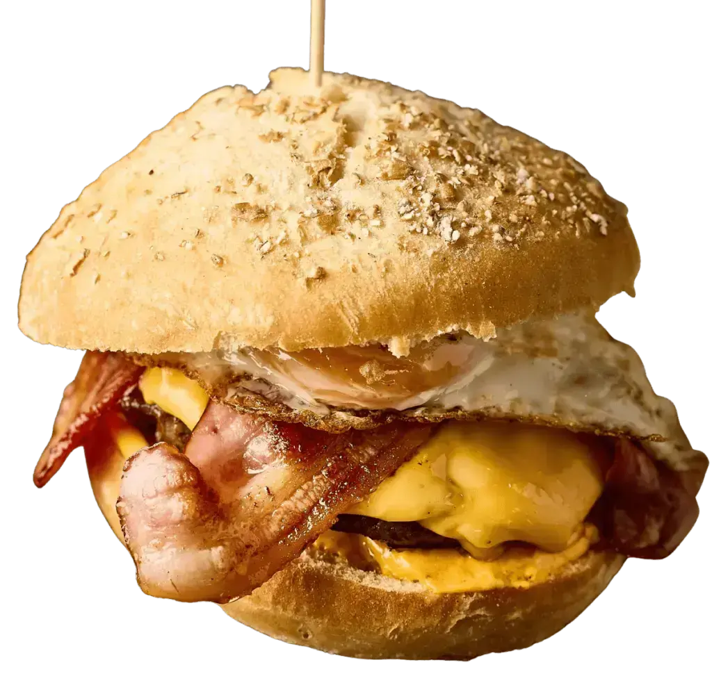 Nuestra hamburguesa estrella: 170 g de auténtica carne de vaca gallega, con beicon, doble cheddar (cremoso y fundido), huevo a la plancha y cebolla crujiente, todo en un pan 100% natural y acompañado de irresistibles patatas rústicas.