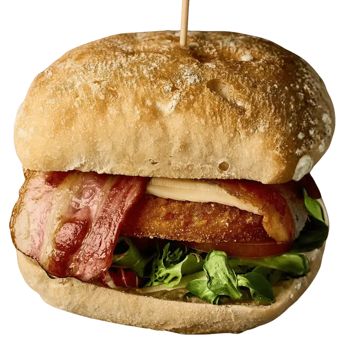170GR DE HAMBURGUESA DE POLLO CRUJIENTE, PAN DE CRISTAL, BEICON, QUESO, LECHUGA, TOMATE, SALSA DE YOGURT Y PATATAS RUSTIK
