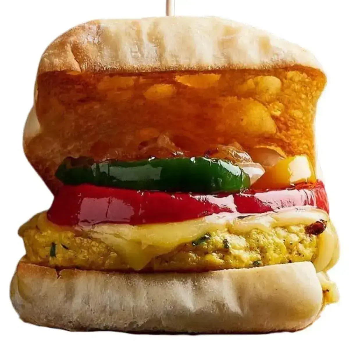 180GR. BURGUER POLLO SAZONADA, PIMIENTO VERDE, PIMIENTO ROJO, PIMIENTO AMARILLO,CEBOLLA ROJA, QUESO GOUDA Y PATATAS RUSTIK